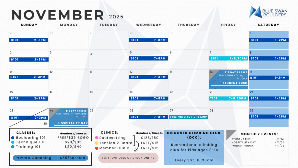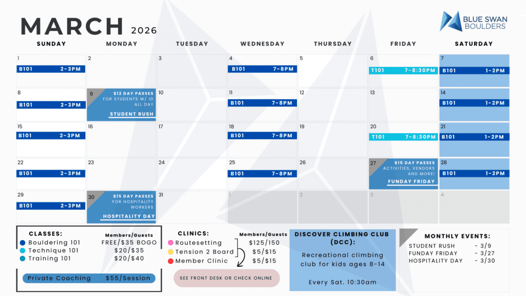Check out this month’s climbing events, student nights and community events!